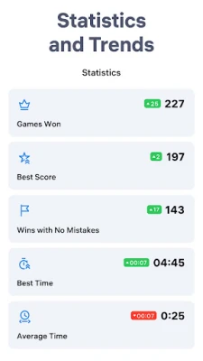 - Statistics. Track your progress for each difficulty level of sudoku puzzle: analyze your best time and other achievements